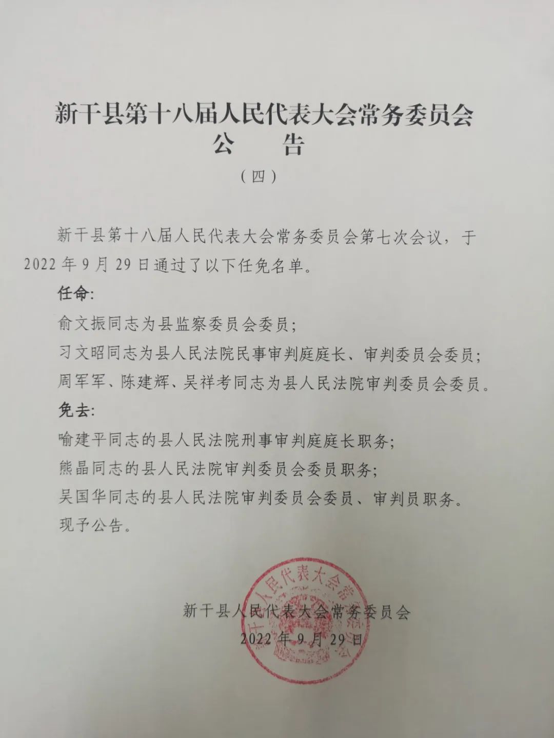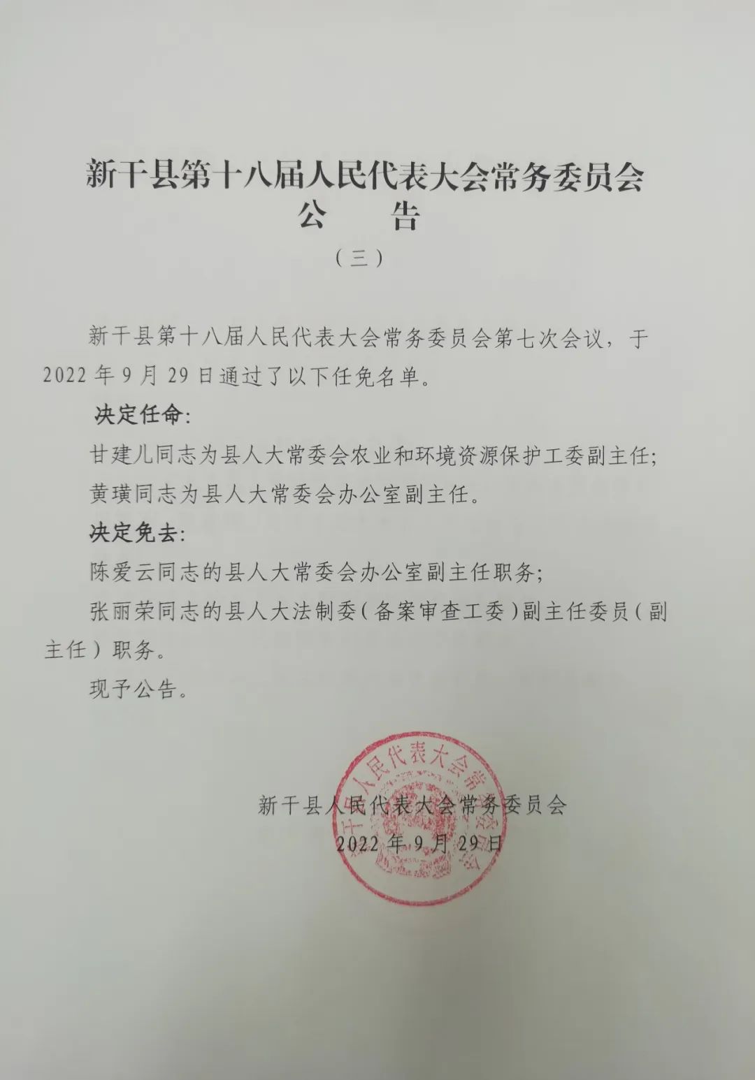 新干县第十八届人民代表大会常务委员会第七次会议,于2022年9月29日通过了以下任免名单。