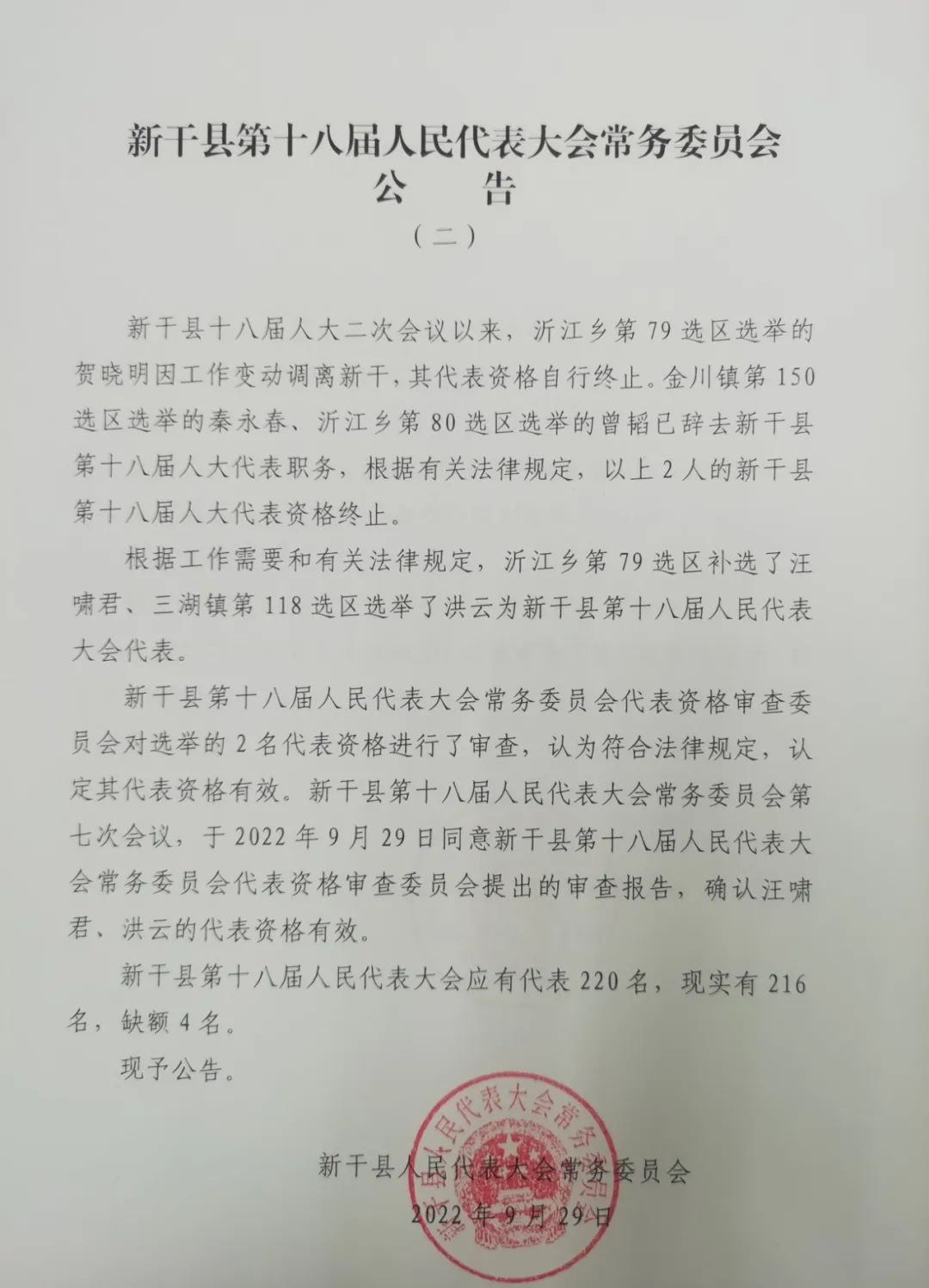 新干县第十八届人民代表大会常务委员会代表资格审查委员会对选举的2名代表资格进行了审查,认为符合法律规定,认定其代表资格有效。新干县第十八届人民代表大会常务委员会第七次会议,于2022年9月29日同意新干县第十八届人民代表大会常务委员会代表资格审查委员会提出的审查报告,确认汪啸君、洪云的代表资格有效。