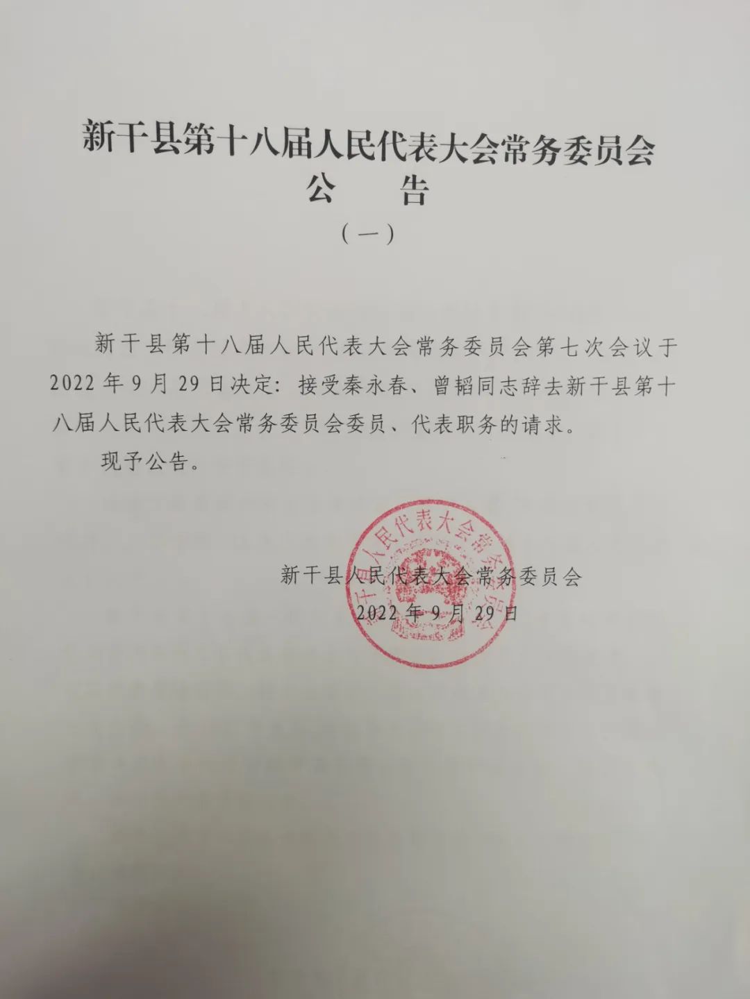 新干县第十八届人民代表大会常务委员会第七次会议于2022年9月29日决定: 接受秦永春、曾韬同志辞去新干县第十八届人民代表大会常务委员会委员、代表职务的请求。
