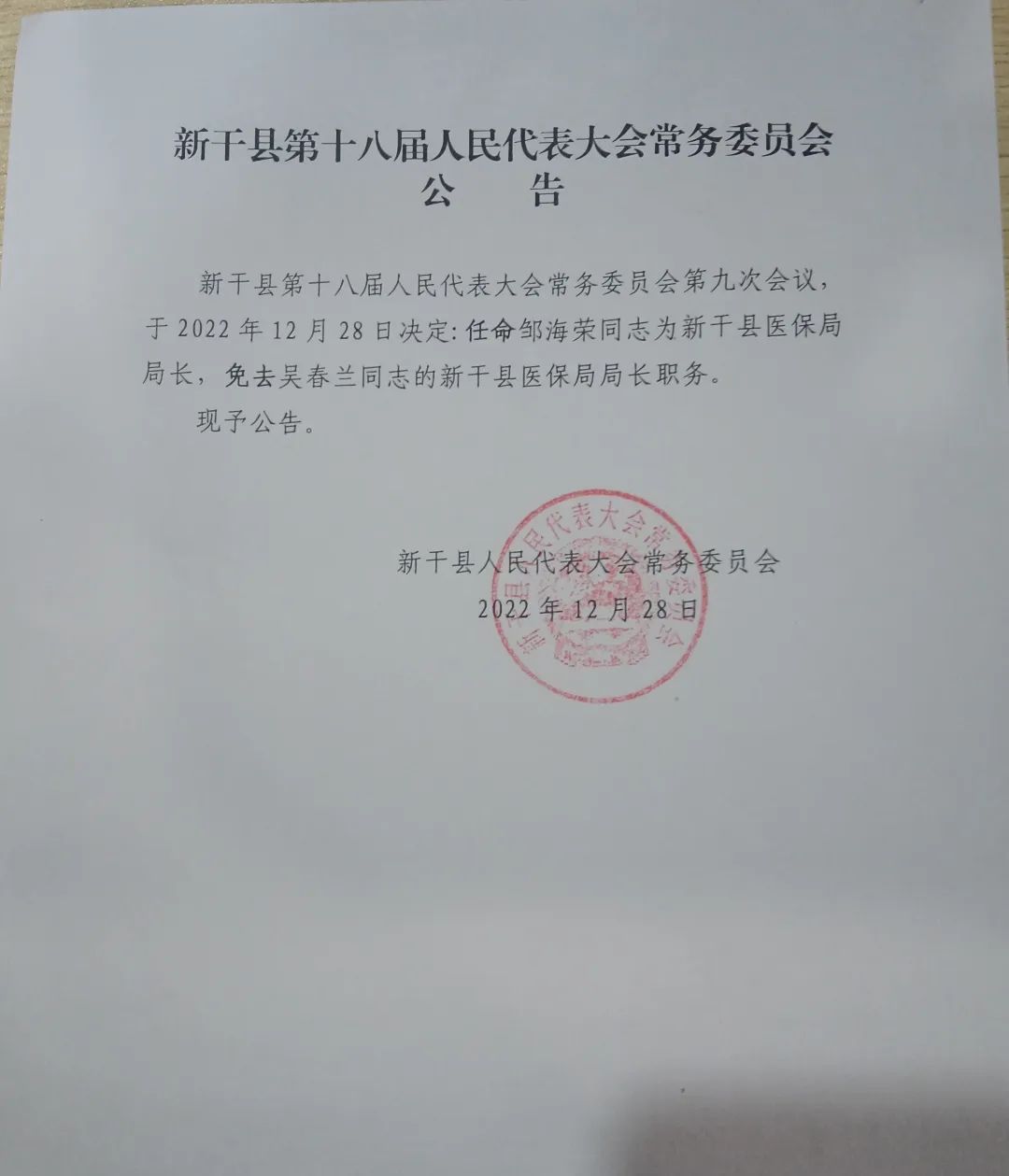 新干县第十八届人民代表大会常务委员会第九次会议,于2022年12月28日决定:任命邹海荣同志为新干县医保局局长,免去吴春兰同志的新干县医保局局长职务。现予公告。
