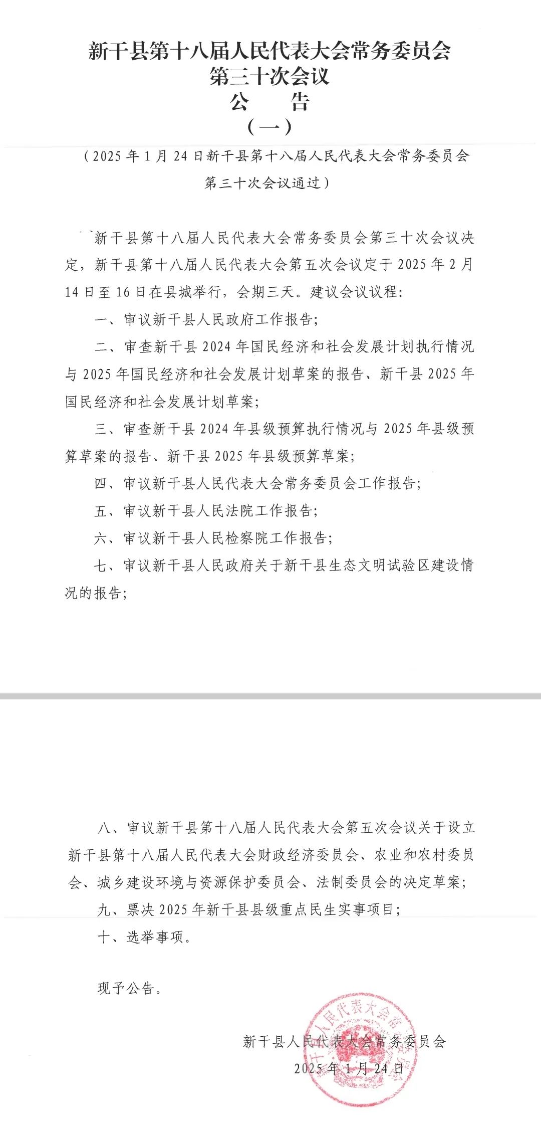 新干县第十八届人民代表大会常务委员会第三十次会议公告