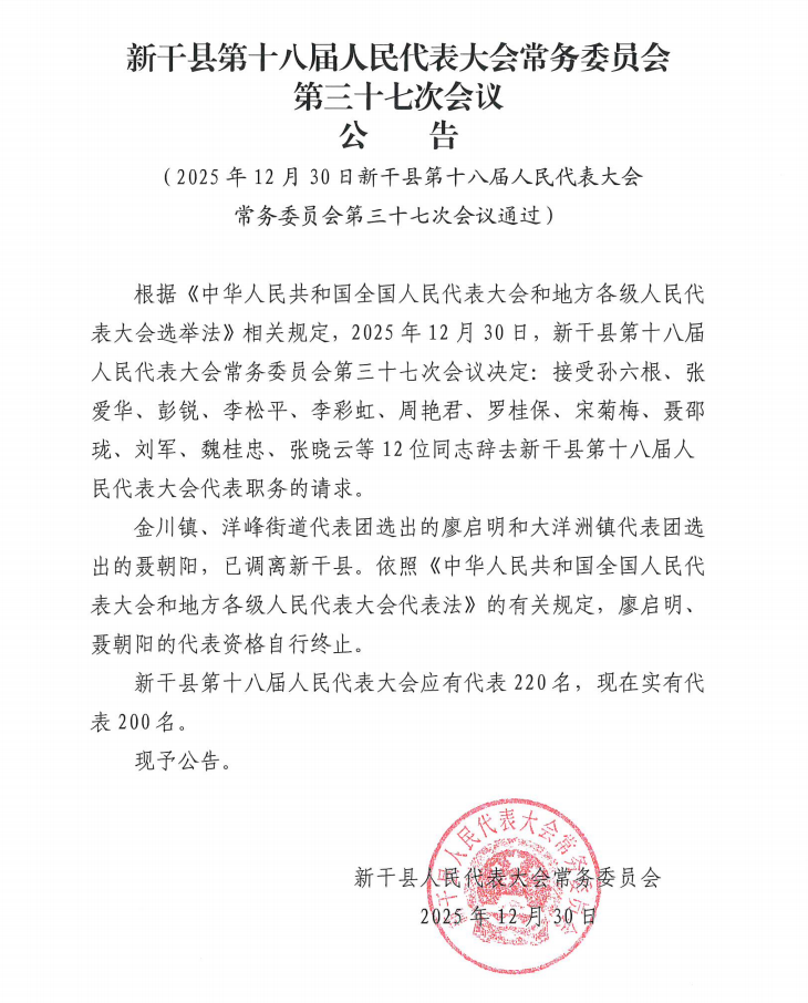 新干县第十八届人民代表大会常务委员会第三十七次会议公告