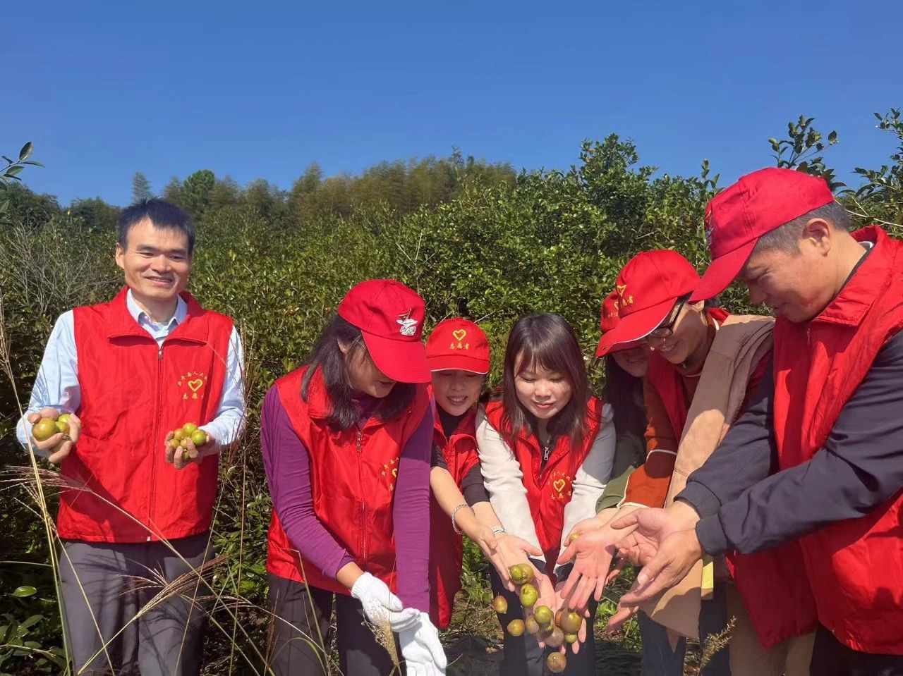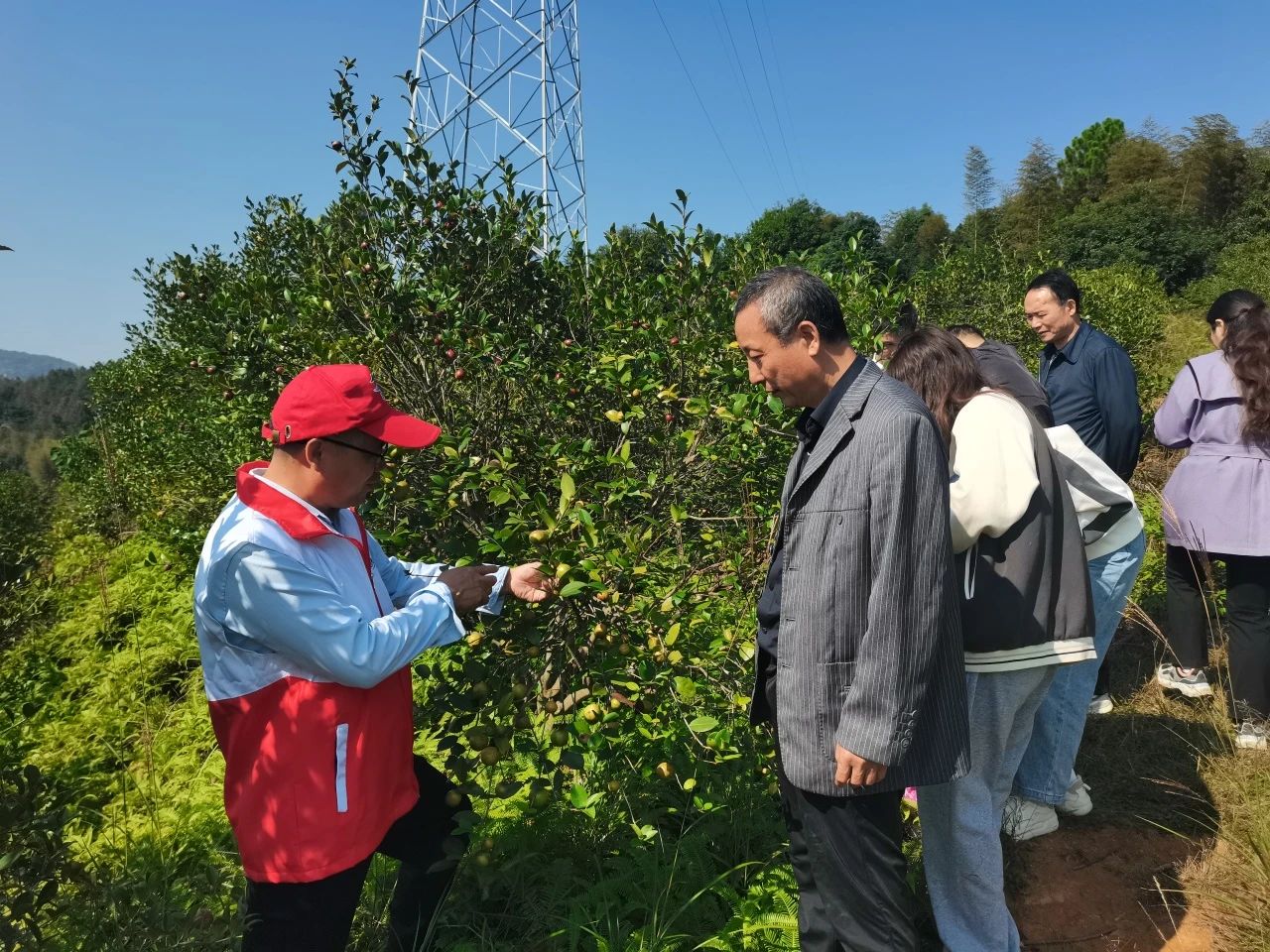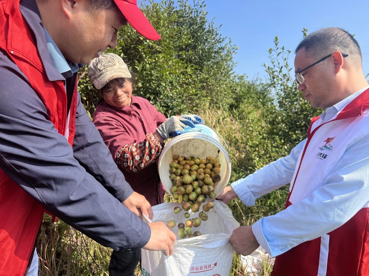 宣讲结束后,全体参加活动的党员集中前往县竹林林场油茶基地开展油茶采摘、技术助农服务。竹林林场油茶基地是新干县农业标准化规模化品牌化提升攻坚战油茶项目的示范基地,辐射带动周边200余户林农种植了1万多亩油茶,是周边林农的主要收入来源,当前正值油茶丰收季,从山上采摘运输油茶果是个需要大量劳动力的工作,为帮助林农解决采摘劳动力短缺问题,片区全体党员来到基地开展助农采摘油茶志愿服务活动,活动中大家齐心协力协助林农采摘、装袋、搬运,一气呵成,丰收的喜悦溢满山坡。
