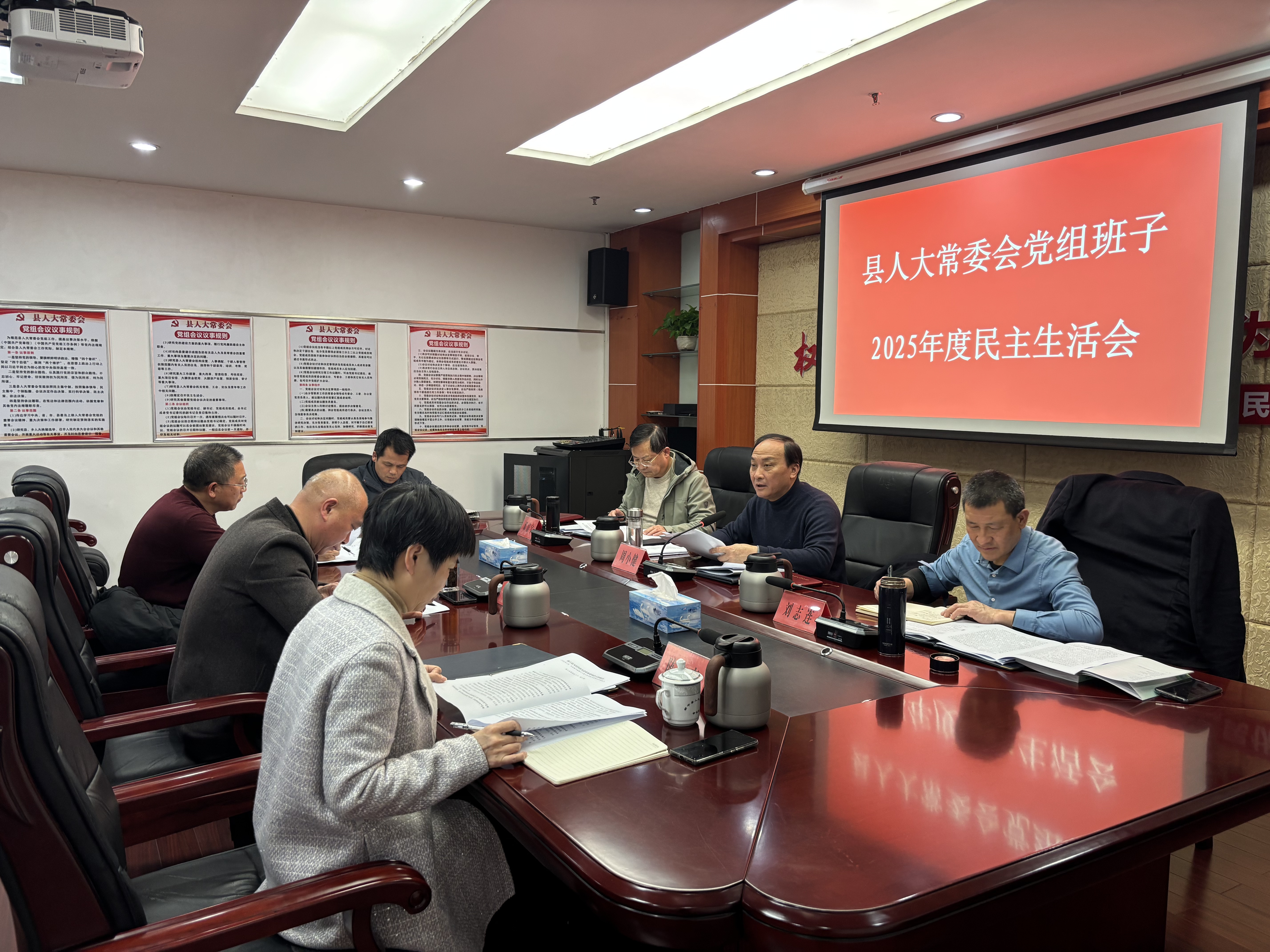 2月6日,县人大常委会党组班子2025年度民主生活会召开。县人大常委会党组书记、主任周小健主持会议并作总结讲话。县人大常委会党组副书记、副主任刘志连,党组成员、副主任邓震宇、刘小峻、方亮,县人大常委会党组成员熊少云出席会议,非中共党员的县人大常委会副主任陈淑春以及各专(工)委负责人列席会议。