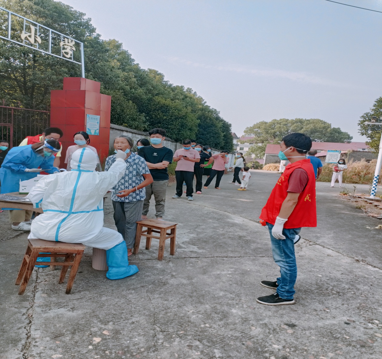 图为李明华同志在引导村民有序做核酸检测